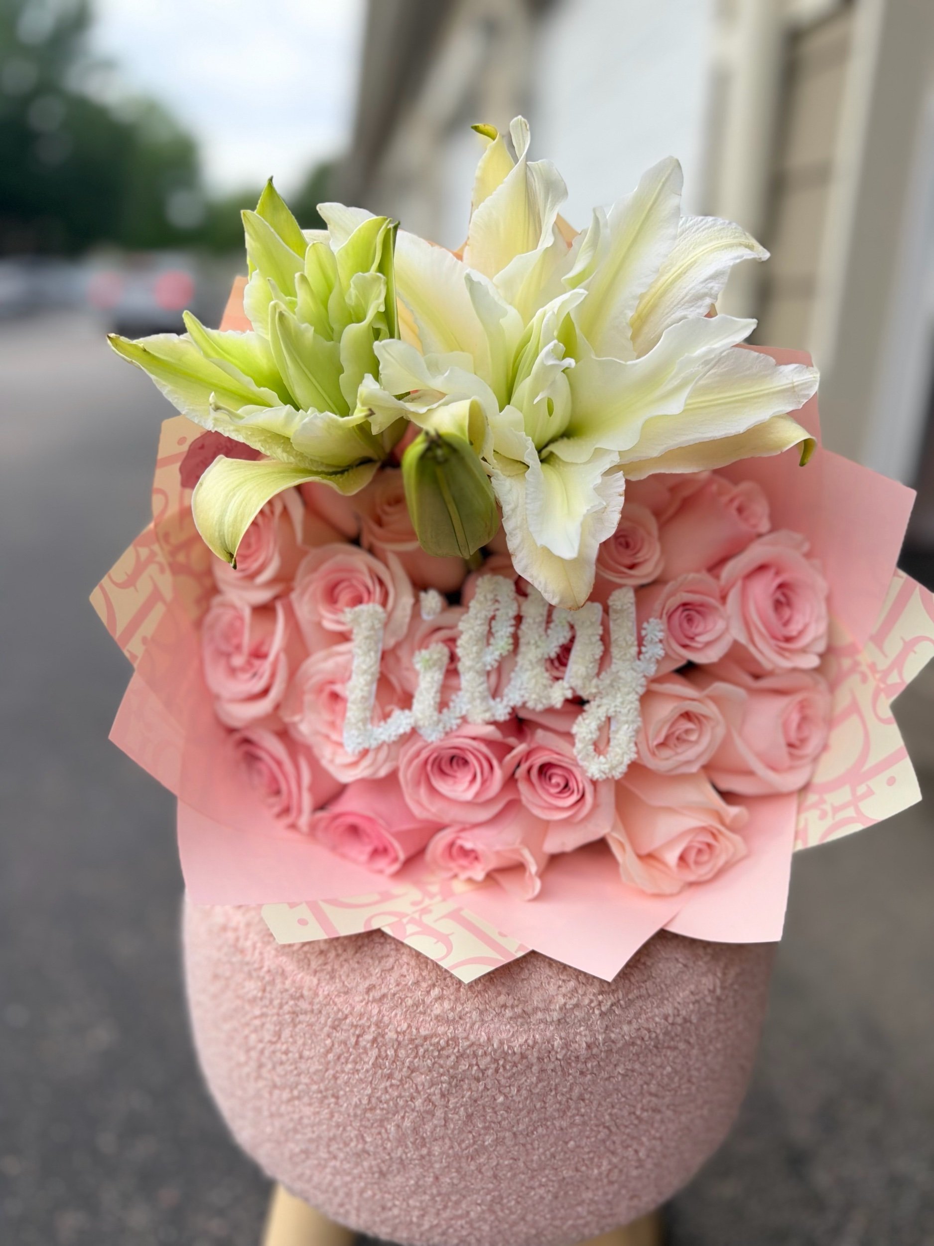 Rose bouquet with Lillies. (Letters can be added for an additional fee)